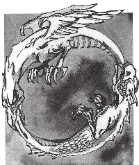 Ahriman and Jazirian, who originally worked together in all things, warred over which plane would be the center of everything. Ahriman chose Baator and Jazirian chose Heaven. They struggled so greatly that, with their tails still in one another's mouths, they forcibly tore apart. The blood from Jazirian's damaged tail formed the first couatls, while the blood of Ahriman, whose terrible fall created a vast pit called the Serpent's Trench, formed the first pit fiends. Ahriman, wounded and imprisoned by the laws he himself created, now goes by the guise of his avatar, the archfiend Asmodeus, while Jazirian remains quietly in the background, using her couatls to gather intelligence on Ahriman's goals.