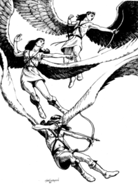 Some avariel call themselves "Al Karak Elam"[5] and tell tales of a hero-king named Hawkwing who aided the king of a city-state in overthrowing a demon-worshiping "high king" who had made sacrifice of several avariel. However, Hawkwing was ultimately betrayed by the victorious king who feared the winged elves might eventually usurp his own rulership. These tales conclude with Hawkwing charging his successors to sever all contact with humans and demi-humans, thus explaining their long self-imposed isolation.[6]