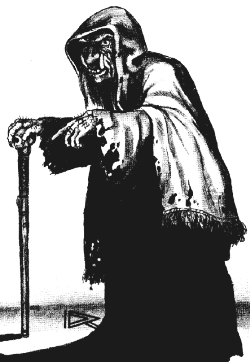 Baba Yaga appears as a hideous, old, human-like woman, some five feet tall. She walks crouched over, and her limbs are almost skeletal.[1] Her skin is grayish brown and tattooed with magical runes. She has a protruding chin, a long nose covered in warts, and ice-cold black eyes framed by stringy white hair. Her fingers end in sharp iron claws, her stony teeth are filed to sharp points, and two large, tusk-like teeth protrude from her jaw.[1]