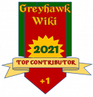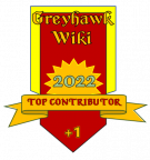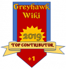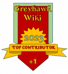 These badges are awarded annually by the Staff of the Great Library of Greyhawk wiki, with collective imput from current wiki-editors, to denote those editors who have contributed the most notable content, most New Pages, and/or the most edits in a given year.