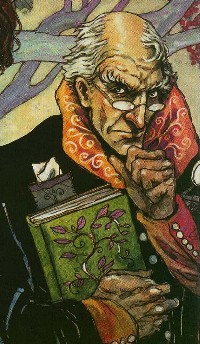 Delleb is depicted as a tall, thin Oeridian man with olive skin. His features are elderly, and the top of his head is balding but for some short white tufts of hair, primarily on the back and sides. He is usually shown with spectacles in modern portrayals, and dressed as a noble scribe or finely attired scholar.