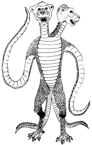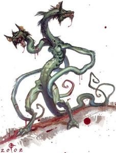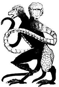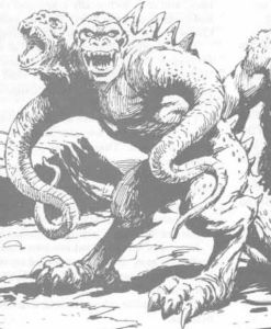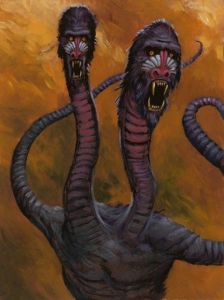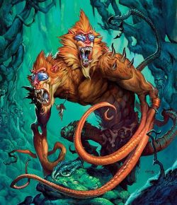 Demogorgon appears as an eighteen-foot tall, reptilian (or amphibious) hermaphroditic demon with a somewhat humanoid form. Two mandrill (sometimes described as baboon) heads sprout from his twin snake-like necks, and his arms end in long tentacles. Demogorgon's two heads have individual personas, called Aameul and Hethradiah. They strive to dominate (and even kill) each other, but are unable to because they are aspects of one another. Despite that, many of Demogorgon's plots revolve around either permanently separating or uniting these two personas.