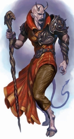 Dispater stands at seven feet tall, is evilly handsome and looks human except for his small horns, tail, and cloven left hoof. He has a rod which acts as both a rod of rulership and a staff of striking that deals double normal damage.