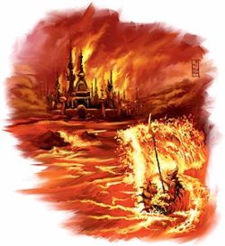 The Elemental Plane of Fire, also known as the "Plane of Burning Skies" in the journals of Tzunk, looks like a normal landscape with one major difference: Everything is cloaked in flame. The majority of the plane is a flaming ocean, but occasionally pockets of solid "land" float upon this. All things burn and scorch mercilessly. The air, too, will scorch and kill those without protection. Efreet are able to grant anyone they desire—mostly their slaves—temporary immunity to the land; otherwise, a traveler must use spells or magical devices to protect himself. The plane is broken up into tiny kingdoms and principalities, each led by a specific ruler who commands a wide variety of races who live together and cooperate.