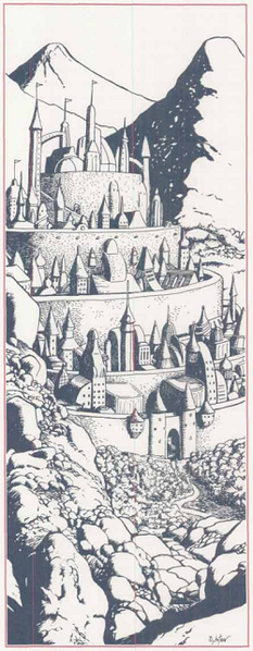 A grey elven mountain city, depicted in PHBR8 The Complete Book of Elves (1992), art by Terry Dykstra.