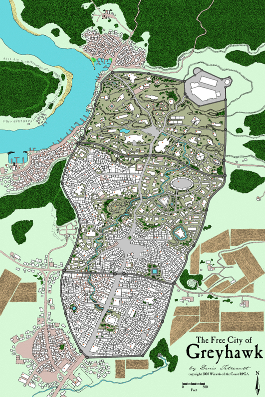 The City of Greyhawk map illustrated by Denis Tetreault for the RPGA, Living Greyhawk Journal #2 (2000).