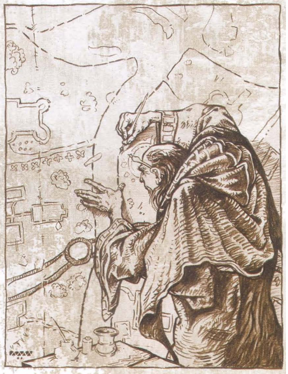 Living Greyhawk Jounral, "Melezakan toils at his masterpiece", p5, art by Matthew Mitchell (2000).—FAIR USE: no other equivalent free image exists, low resolution, image relates to topic of academic discussion, WotC Fan Content Policy.