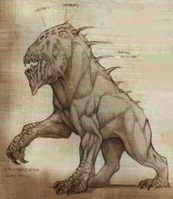 Grigaurs are eyeless predators, approximately the size and shape of a bear, but hairless, reptilian, and scaled, with hornlike spines running down their backs. These spines are sensory organs that help compensate for their blindness.