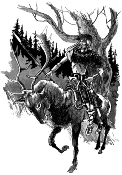 Grugach possess a close kinship with the animals of the woodlands, often dealing with them more equally than with humanoids.[1] Grugach frequently use large stags as mounts.[2][3][4]