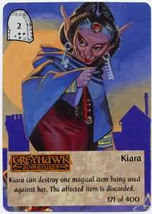The first appearance of this character, with the name "Kiara" attached to her was in 1992, for the TSR Trading Cards line (card #174). Later, in 1994, she would appear again on Spellfire CCG (card #171 of 400), and would have lore presented in the Spellfire Reference Guide'.[2]