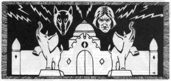 The Lost City, as depicted on a tapestry beneath Maure Castle, is imposing in size, with two tuskless elephants sculpted in bronze guarding its gate. The city seems uninhabited when seen from without, with a large domed building towering over the battlements. The sky is shown crackling with lightning (this is, coincidentally, the way the sky of Luna is portrayed in Return of the Eight).