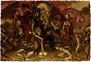 After the Demon War, the gnolls had various engagements with their former allies, the minotaurs, on and off for years. In the end, the gnolls were victorious, but paid a terrible price for it because they had to fight the final battles against their enemies in the underoerth terrain of labyrinthine tunnels and caverns where the minotaurs lived and were stronger.