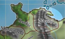 Naresh occupies the far northeastern corner of Western Oerik, barely sharing a border with the Disputed Regions. A long coastline along the Jotnumheim Sea and Mare Mysticum bounds the north. The entire eastern border of Naresh is beyond the mountain range and is in contact with foreign lands. Naresh adjoins Gigantea which has "a semipermanent bridge of ice [which] connects ... Oerik proper"[6] and the polar area called Hyperboria.