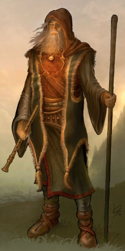 Obad-Hai is most often depicted as a lean and weathered old man of indeterminate age, dressed in brown or russet. He carries a wooden staff called the Shalmstaff, and is known for playing a woodwind instrument called a shalm or shawm. Obad-Hai can appear as a human, dwarf, gnome, or halfling, and has worshipers among all four races. He is also depicted in the forms of various animals or fey.