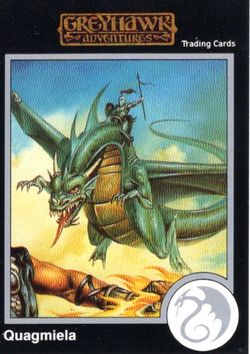 The difficulty comes in the fact that the green dragon and rider in this artwork were very, very minor NPCs presented in Artifact of Evil, by Gary Gygax. In that novel, a green rider and dragon appear as opponents of Gord the Rogue and his adventuring party, sent to delay or stop them. The scene is depicted on the cover of the book, but the NPCs are not named and never appear again. So, it is unclear whether the card gives a name to an existing NPC or simply uses the art to depict a green dragon and her rider. However, Quagmiela's home being referred to as a "tropical" rainforest[2] (rather than a temperate one) tends to indicate that it is not the same dragon, because while the dragon depicted in Artifact of Evil also resides in a cave, it is in the vicinity of the southern Welkwood[3] which is not tropical.