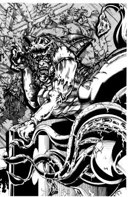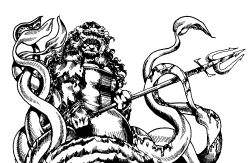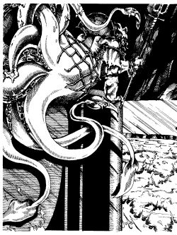 The Queen of Chaos has the upper torso of a corpulent, blue-skinned humanoid female, whereas her lower body is a mass of ten mauve tentacles. Hidden in the tentacles is a razor sharp parrot-like beak. The Queen has long drooping locks of green hair, and she wears a sahuagin skull as a crown. Her weapon of choice is a huge trident.