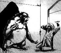 An ape-headed rakshasa reveals its true form to a cowering human. From Dragon #84. Art by Jim Holloway.