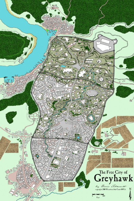 The Tetreault map followed the maps in The City of Greyhawk (1989) by Valerie Valusek and Dave "Diesel" LaForce. It filled in much of the open space from previous maps, and gave the city an appearance commensurate with the population given in official sources.