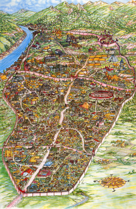Valerie Valusek's poster map in The City of Greyhawk boxed set is the original illustrative look at the city in a map. It is a creative isometric view of the city, similar in style and appearance to a "tourism map" or "amusement park map" where the features and buildings are exaggerated in size. The map is lavishly detailed, with minor narrative elements like ox carts, people walking near markets, mounted people on horses, statuary, garden benches, strange gladiatorial apparatuses in the Free City Arena, and magical energy crackling from atop the University of Magical Arts. Though there are clearly a variety of architectural styles depicted throughout the city, including onion-domed towers, pyramids, tents, and even "hobniz-holes" in Burrow Heights, the predominant facade of the city's buildings is of half-timbered "Tudor" style. As might be expected in a pseudo-medieval metropolis, a dizzying array of structural materials can be found illustrated in the map, including stone, thatch, tile, shingles, timber, and brick-and-mortar.