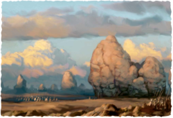 Strange rock formations in Western Oerik, and armies on the march.Chainmail Core Rulebook, art by Sam Wood (2002).