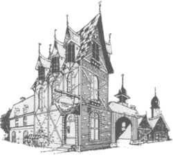 The Whistling Fish inn, art by Ken Frank in Falcon's Revenge (1990). | |