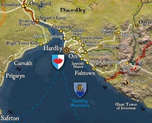 Hardby is built around the eastern portion of a deep port called Hard Bay which is just off Woolly Bay, at the foothills of the Abbor-Alz hills. For many, Hardby is the gateway to the south and to the Bright Desert. The harbor itself is navigable by even large ocean-sailing ships. The southern edge of Hardby faces onto sea cliffs which help make Hard Bay more secluded and a safer harbor.