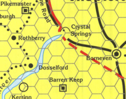 Crystal Springs is a set of natural springs covering an area of about fifteen square miles or so, where the water flows from a series of small rocky outcrops. They are the source of the Duntide River, and located astride the Stone Road. Water from subterranean aquifers bubbles to the surface here. The rock formations of almost glassy blue-veined quartz around the springs tend to be brittle, with the rock is of little use although it is weather resistant and resists erosion. This strange geological formation is believed to have magical origins, and mixed intermittent and erratic dweomers that vary with the phases of the moons (Celene and Luna) can be detected here. A subterranean network of caves and chambers below the rock formations are rumored to contain monstrous and magical secrets in their calcified chambers. There are several militia bases with 60-200 soldiers within five miles of the springs.[1]