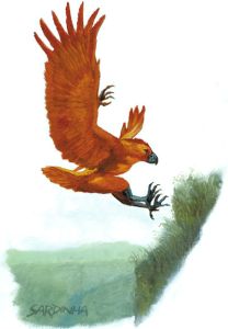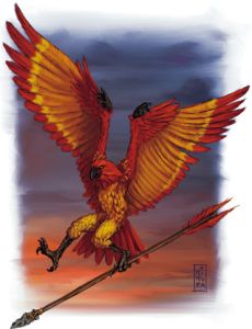 Aarakocra resemble humanoid birds. The average specimen stands about five feet tall and has a wingspan of twenty feet. Halfway along the edge of each wing is a hand with three human-sized fingers and an opposable thumb. An elongated fourth finger extends the length of the wing and locks in place during flight. The hands cannot grasp while flying, but are nearly as useful as human hands when an aarakocra is perched and its wings folded back. Their powerful legs end in four sharp talons that can unlock and fold back to reveal another pair of functional hands. These humanoids have hollow, fragile bones. Their faces combine the features of both parrots and eagles. They have gray-black beaks and black eyes. Plumage color varies, but males generally have red ,orange, and yellow coloration, while females tend towards brown and gray.