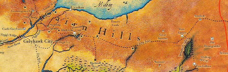 The Free City of Greyhawk is located centrally in the Flanaess, which is the easternmost part of the continent of Oerik on the world of Oerth. The city controls a large swath of land along the Selintan River from the Nyr Dyv south to Woolly Bay, most of the Cairn Hills, parts of the Gnarley Forest, the northern Wild Coast, and parts of the Abbor-Alz. The entire region is officially known as the Domain of Greyhawk. The Domain is bordered on the east by the Abbor-Alz and its western border lies within the Gnarley Forest. The area south of Greyhawk City along the Selintan is known as the Plain of Greyhawk.